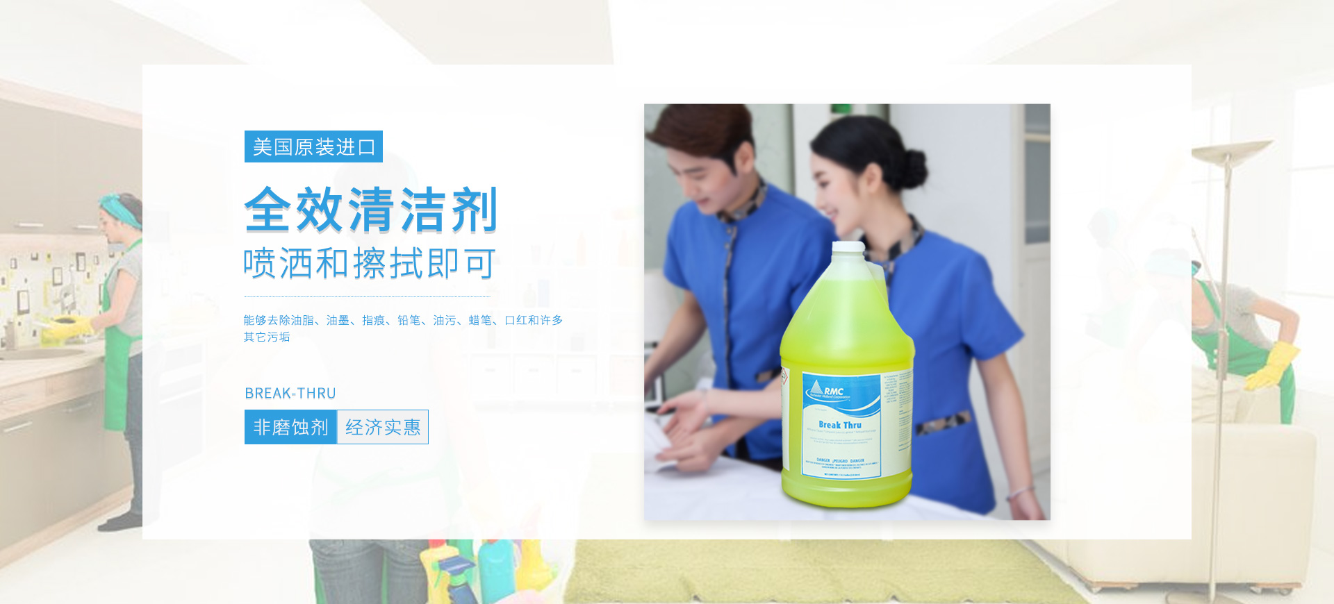 新朗環(huán)境自2015年起與美國(guó)具百年歷史的跨國(guó)企業(yè)RMC(Rochester Midland Corporation)合作, 進(jìn)口 RMC用于機(jī)械制造、交通運(yùn)輸、航天航空、石油化工、食品禽肉乳制品加工等工業(yè)生產(chǎn)制造行業(yè)的專(zhuān)業(yè)清洗、滅菌系列產(chǎn)品,以及酒店、CBD大廈、學(xué)校(包括幼稚園)、醫(yī)療機(jī)構(gòu)、百貨商場(chǎng)、養(yǎng)殖業(yè)、餐飲業(yè)等商用行業(yè)清潔、消毒系列產(chǎn)品,還有專(zhuān)用于各個(gè)行業(yè)單位“廁所革命”的公共衛(wèi)生間根源除味第5代SANOR?衛(wèi)生間自動(dòng)滴管系統(tǒng)、第6代百屋潔SIOGIENIUS?電子控制衛(wèi)生間自動(dòng)滴注系統(tǒng)等系列產(chǎn)品項(xiàng)目。